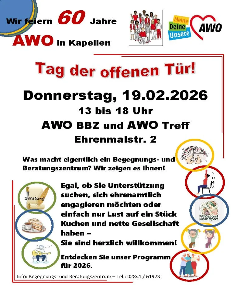 Die AWO in Moers-Kapellen feiert am Donnerstag, 19. Februar 2026, ihr 60-jähriges Bestehen.