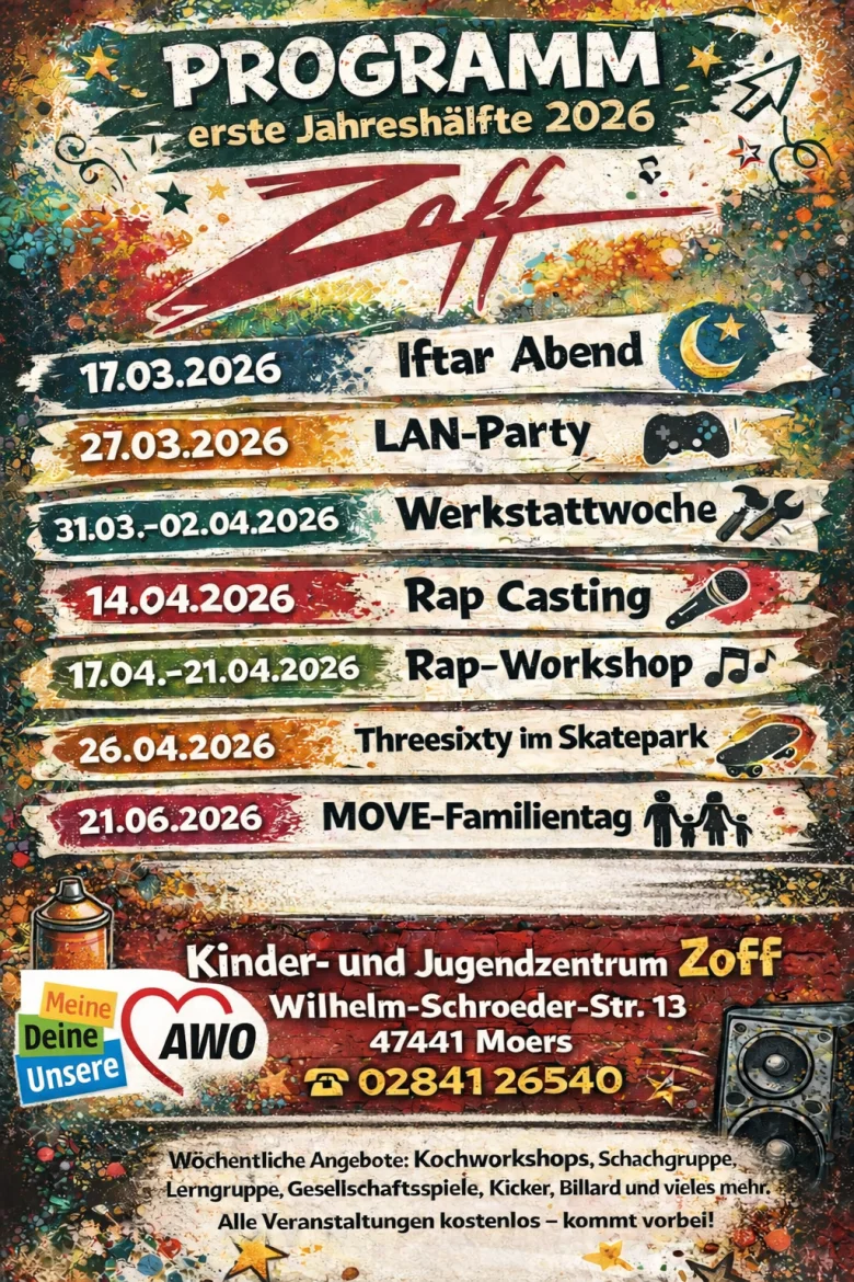 Das AWO Kinder- und Jugendzentrum „Zoff“ an der Wilhelm-Schroeder-Straße 13 in Moers-Mitte hält auch in diesem Jahr wieder zahlreiche Angebote und Projekte bereit.