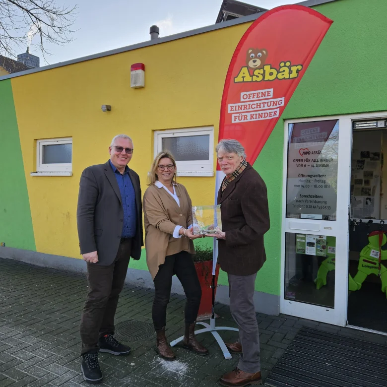 „Ganz viele Kinder konnten glücklich gemacht werden“ so Göke, als er mit Ehrenamtlichen auf dem Moerser Weihnachtsmarkt diese Spielsachen wieder verschenken durfte. Die freiwilligen Spenden, die dabei zusammengekommen sind, insgesamt 900,00 Euro, wurden von Göke im Rahmen einer kleinen Besichtigung und eines Austausches zur Arbeit im Asbär an die Leiterin der Einrichtung Claudia Deselaers und Bernd Riekemann übergeben, die im Vorfeld nie mit so vielen Spenden und einer solch hohen Summe gerechnet hätten. Göke zeigte sich beeindruckt von der guten und vielfältigen Arbeit, die von den hoch motivierten Mitarbeiterinnen und Mitarbeitern geleistet wird. Der Asbär ist eine offene Einrichtung der AWO für alle Kinder im Alter von 6 bis 14 Jahre und deren Familien. Der Erlös soll in ein Theaterprojekt fließen, welches mit den Kids auf die Beine gestellt werden soll unter dem Motto „Der Asbär macht Theater!“